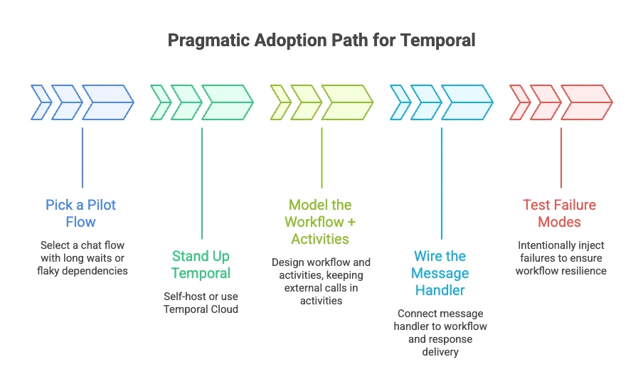 Alt: Pragmatic adoption path for Temporal showing steps to build resilient chatbots: pick a pilot flow, stand up Temporal, model workflows and activities, wire the message handler, and test failure modes.