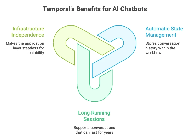Alt: Diagram of Temporal benefits for AI chatbots: infrastructure independence, automatic state management, and long-running conversational workflows.