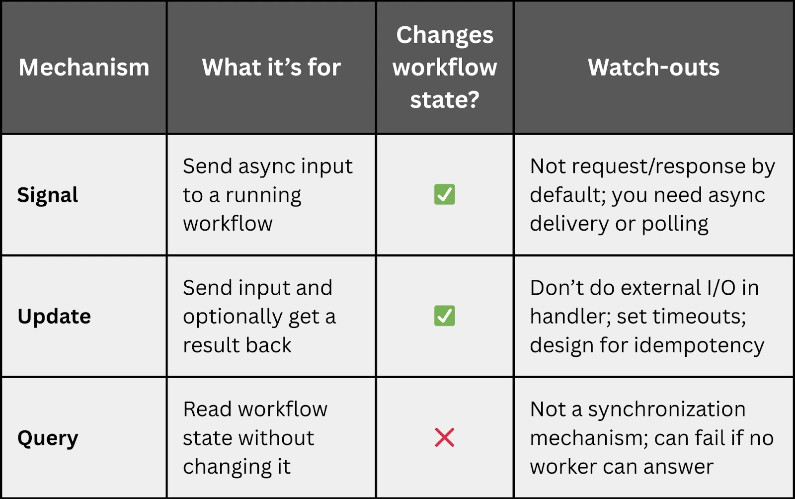Alt: Temporal workflow comparison of Signal, Update, and Query mechanisms