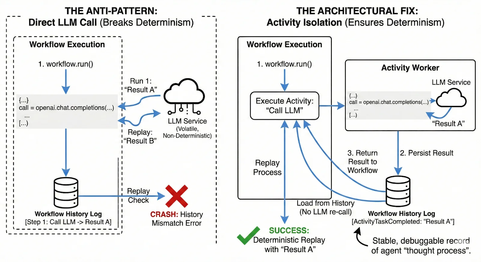 But LLMs are inherently non-deterministic. Even with temperature=0, floating-point non-determinism on GPUs can yield slight variations. If you call a non-deterministic operation directly inside a Temporal Workflow, you will break the Determinism Assumption. The workflow will crash on replay because the history won’t match the new execution.