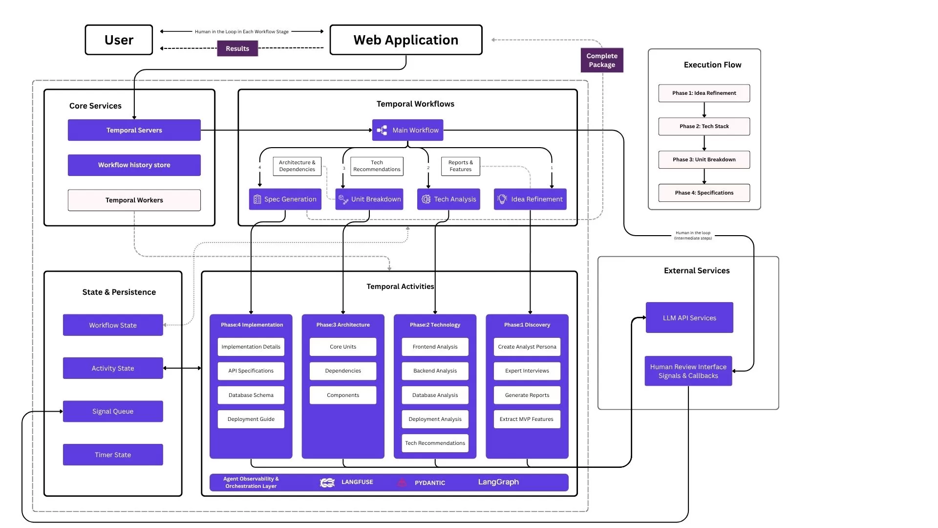 | Orchestration Layer | Temporal workflows, LangGraph agent coordination, Pydantic validation schemas |