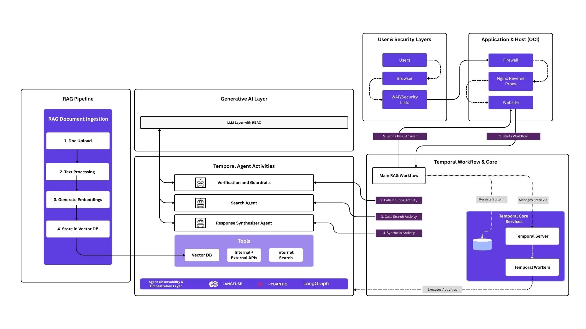 - Comprehensive Observability: Real-time monitoring provides visibility into query processing, LLM performance, and workflow execution patterns.