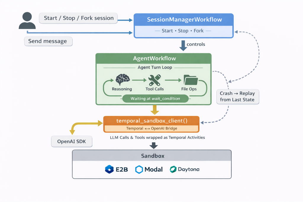 - Zero-Cost Idling: Because the workflow persists on the Temporal server rather than in a running process, organizations can scale to thousands of concurrent sessions without paying for idle sandboxes.