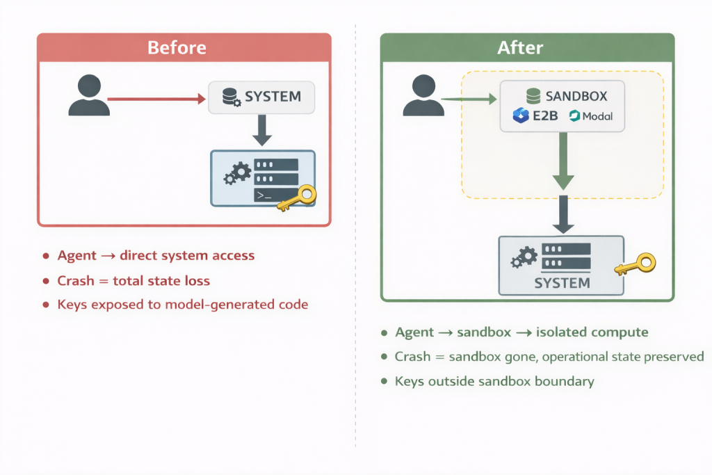 Beyond security, sandboxing also solves a cost and reliability problem. Long-running agent tasks — compiling a financial report, processing a document pipeline, running an automated code review — frequently fail midway due to network timeouts, container crashes, or API rate limits. Under the old architecture, losing the sandbox meant losing the entire run. Under the new architecture, losing the sandbox container does not mean losing the operational run. State is preserved. Work is not wasted.