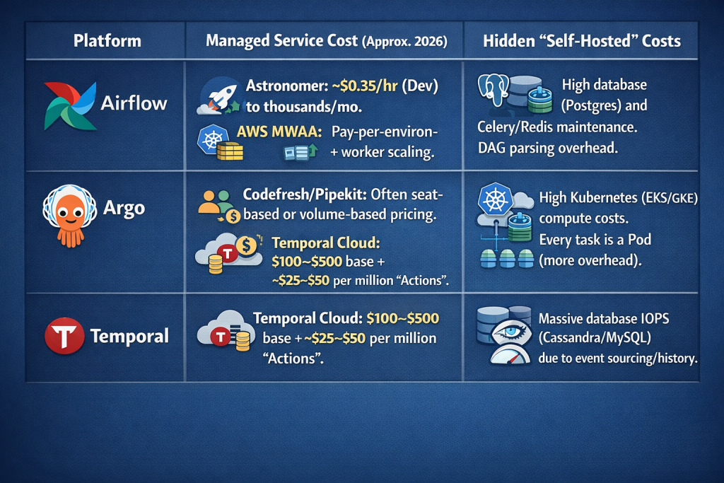 Pro Tip: Airflow and Argo pricing is often tied to Compute Time (how long the task runs), whereas Temporal pricing is tied to State Changes (how many events occur). If you have a workflow that waits for 30 days, Temporal is nearly free while waiting; Airflow might still charge you for a running sensor task.