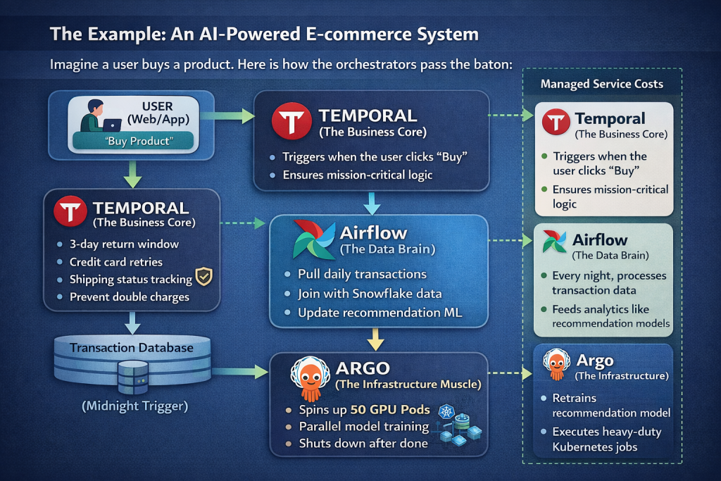 • Action: When Airflow decides the recommendation model needs retraining, it triggers an Argo Workflow. Argo spins up 50 GPU-enabled Kubernetes pods to process the massive dataset in parallel and shuts them down when done.