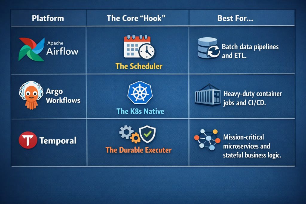 In 2026, the debate over Temporal vs. Airflow vs. Argo has moved past “which is better” to “which architectural gap are we filling?”.